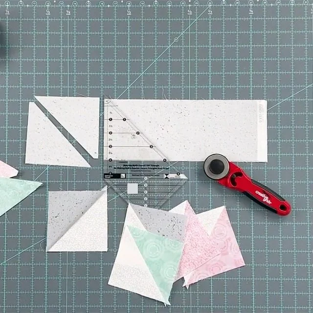 This multi-sized ruler features two triangles in one. Use the 45-degree side to cut half-square triangles from strips up to 5-1/2 inches wide, creating half-square triangles up to a finished size of 5 inches.