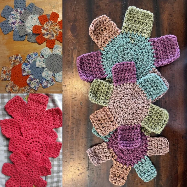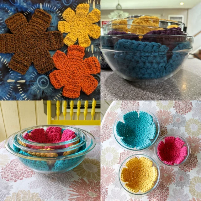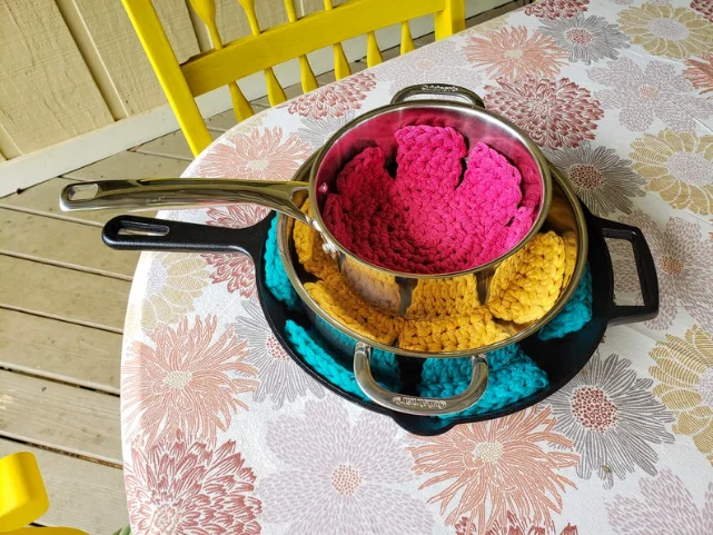 Crochet always seems to come in handy, doesn't it? I was packing pots and pans into our camper and realized they might end up banging around as we drove, so I thought it might be helpful to crochet something to protect them from getting scratched or damaged! That is how these pot protectors came to be!! You can use them to protect your pots, pans and even glass bowls when you stack them!