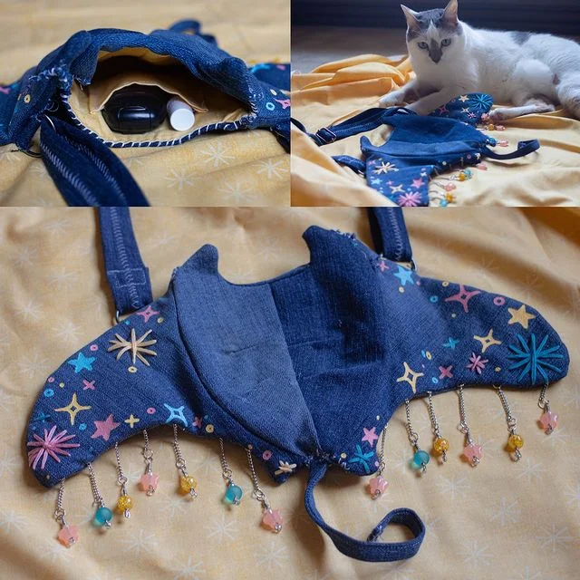 Say hello to the Manta Ray Bag! This digital sewing template helps you transform your trusty old jeans into a stylish, eye-catching bag. But this isn’t your regular pattern—it’s a project full of endless customization! Keep it sleek and simple, or go wild with embroidery, ribbons, and personalized touches. The pattern includes tons of photos and even videos to help guide you through every stitch. ✨
