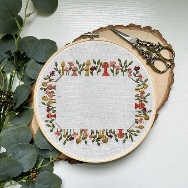 On this embroidered kit, the pattern of wild flowers and mushrooms is just right to show the humorous design style.