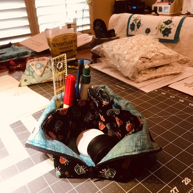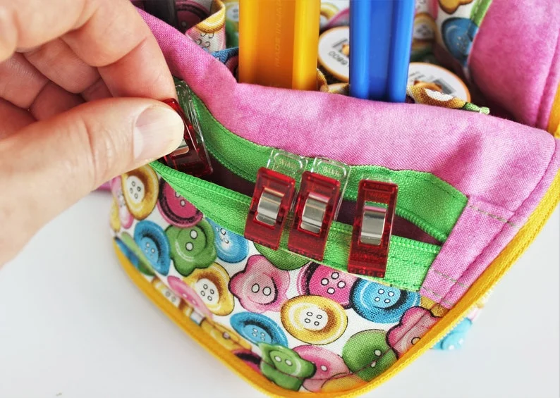 This catch-all organizer also zips up to enclose the contents, making it a perfect way to take your small sewing supplies with you to a class, retreat, or sewing day. When you get to your destination, just unzip the bag, fold the top down, and you're ready to sew!