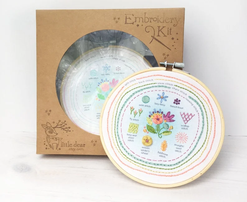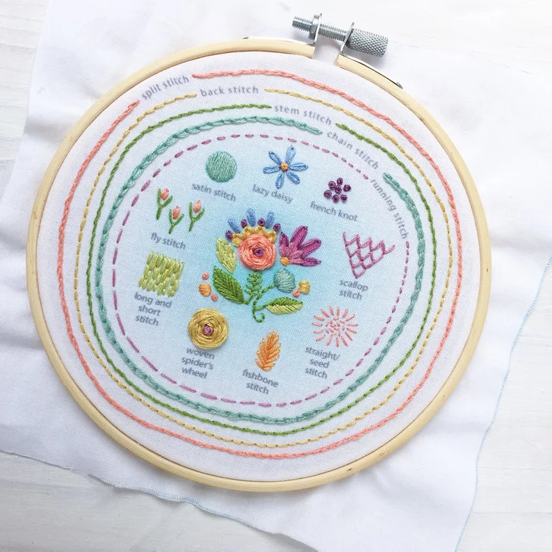 Stitch Sampler Kits are here! This kit includes everything you need to embroider this colorful stitch sampler. You will love learning 14 basic embroidery stitches as you embroider this rainbow colored design. When you're done, you'll have a beautiful and handy stitch reference, or frame it right in the hoop to create your own modern embroidery hoop art. Easy enough for a beginner to learn on, it is so much fun to make and lovely to display!
